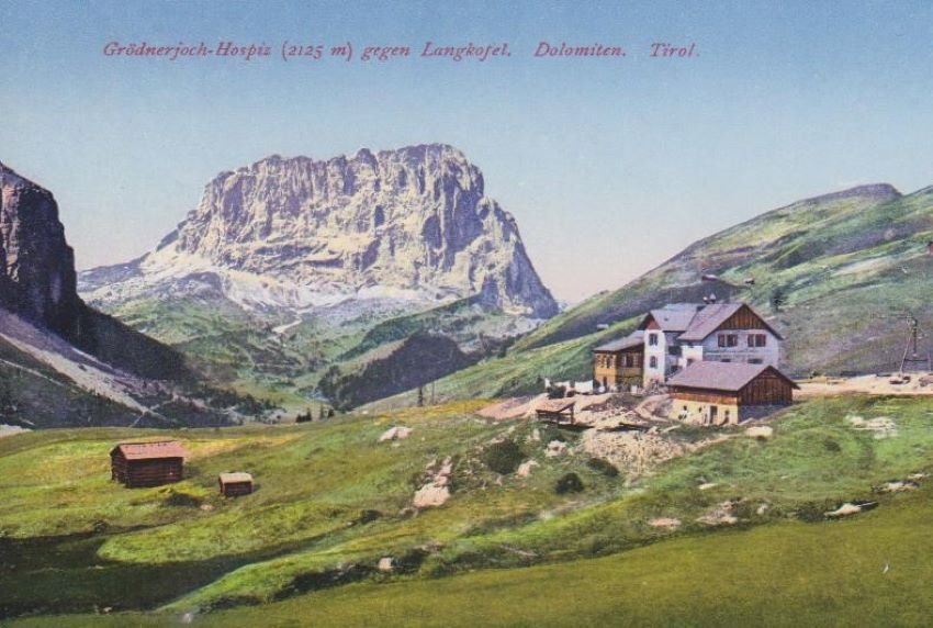 Grodnerjoch-Hospiz (2125 m) gegen Langkofel. Dolomiten.
