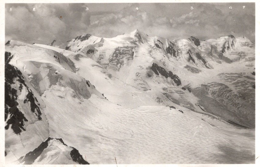 Gruppo Ortles - Cevedale. La Vedretta del Forno dal Viòz m. 3644. 1) P. di Peio m. 3549 - 2) P. Cadini m. 3524 - 3) P. Giumella m. 3596 - 4) P. di S. Matteo m. 3684 - 5) C. Dosegù - 6) P. Pedranzini m. 3596 - 7) Pizzo Tresero m. 3602.