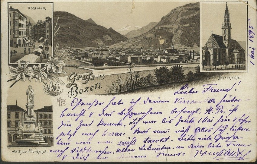 Gruss aus Bozen - Obstplatz - Walther-Denkmal - Ptarrkiche.
