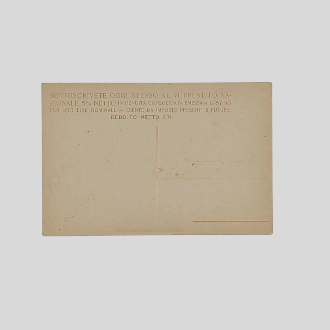 cm 9x14. Cartolina non viaggiata con lievi tracce d'uso. Il VI prestito nazionale al 5% netto, venne deliberato nel 1918 dopo la vittoria del Piave. Lo scopo del prestito era di recuperare le spese di guerra fino allora sostenute. La sottoscrizione venne avviata nel 1920, è dunque tra questi anni va collocata la stampa della cartolina.