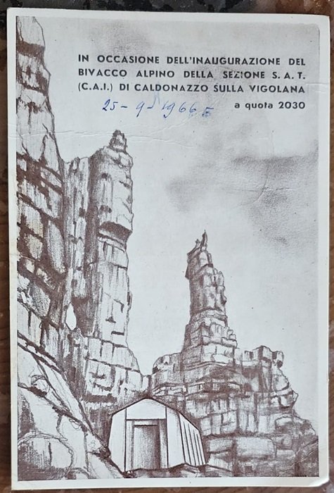 In occasione dell'inaugurazione del bivacco della sezione S.A.T. (C.A.I.) di Caldonazzo sulla Vigolana a quota 2030: 25-9-1966.\r\n