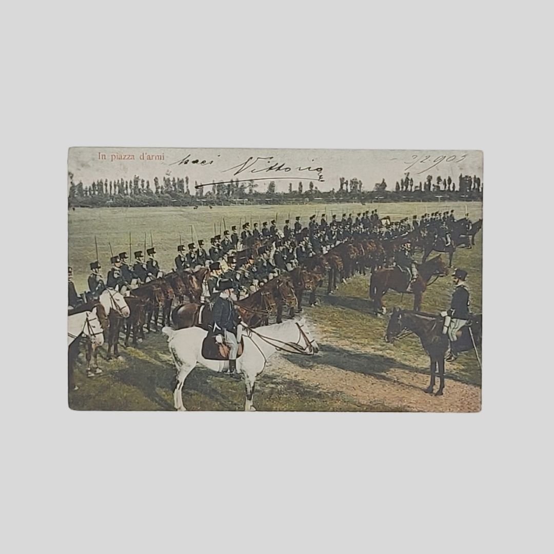In piazza d’armi. Cartolina originale in fotocromolitografia del Regio esercito.