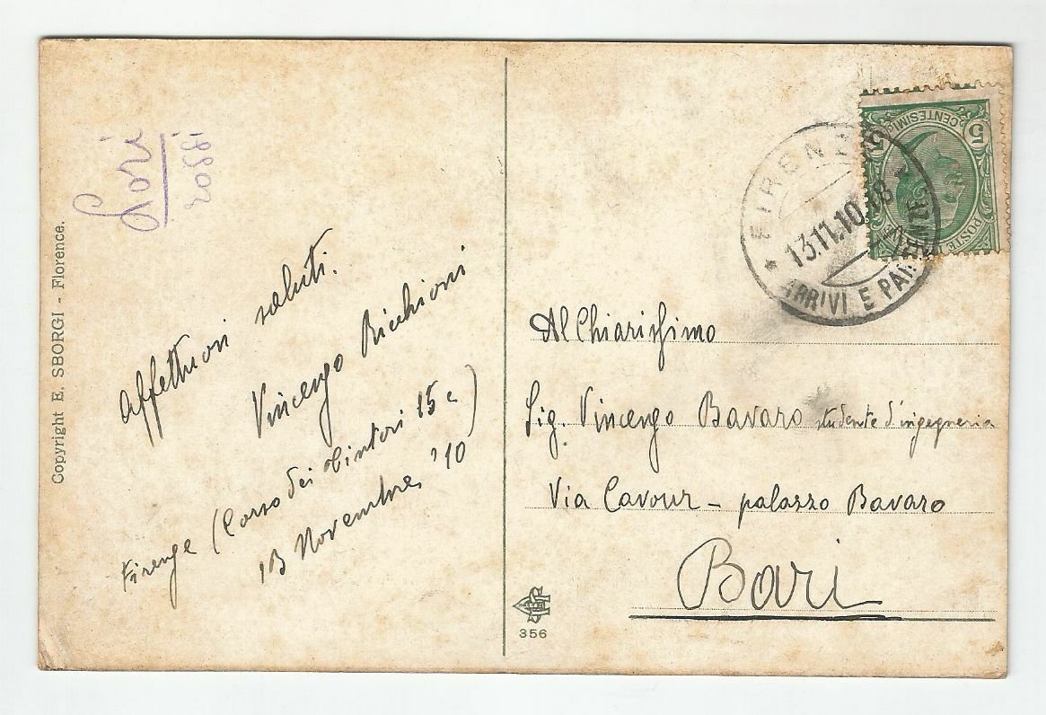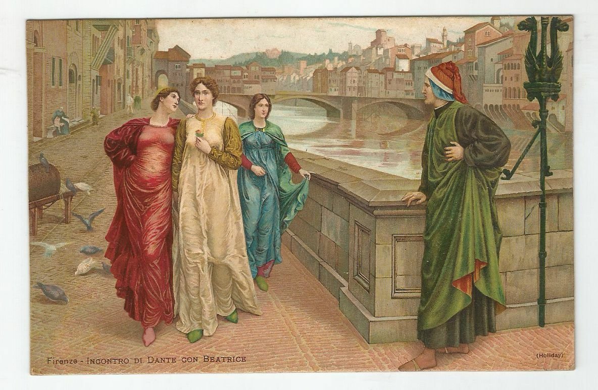 INCONTRO DI DANTE CON BEATRICE Bella cartolina originale viaggiata il 13 novembre 1910 con firma autografa del professore agronomo, parlamentare del regno e rettore universitario Vincenzo Ricchioni.