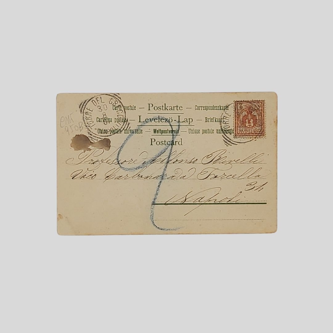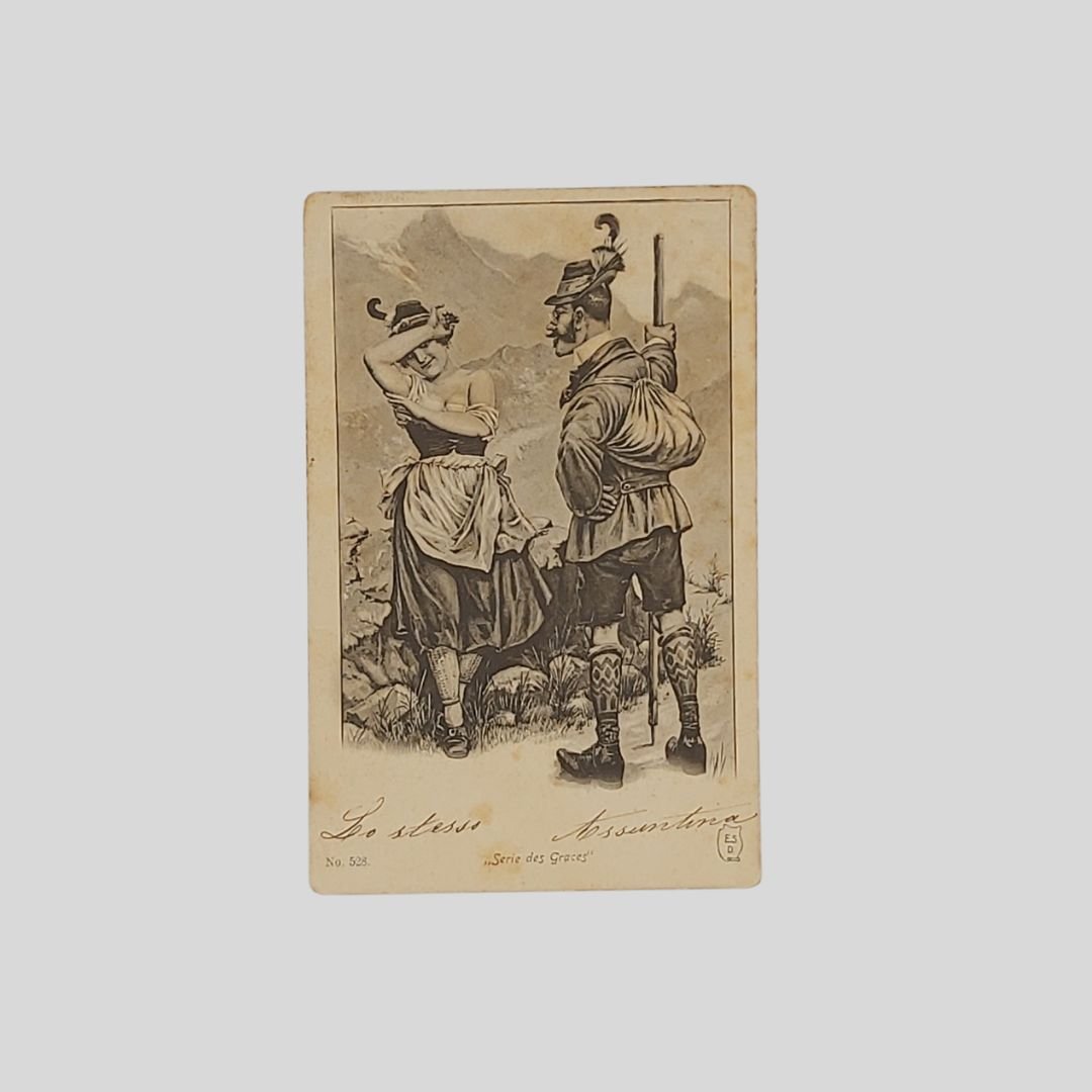 Undivided back, cm 9x14. Cartolina viaggiata, francobollo, postalizzata in Italia il 30/08/1901.Tracce d'uso. Iconica cartolina raffigurante una coppia, in abiti tradizionali, tra i monti. Non comune.