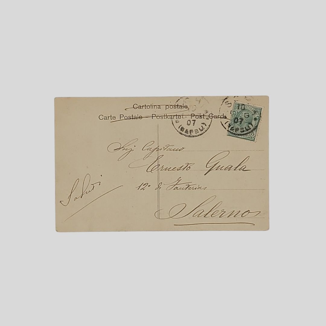 cm 14x9. Cartolina fotografica originale viaggiata, francobollo, timbri. Tracce d'uso.