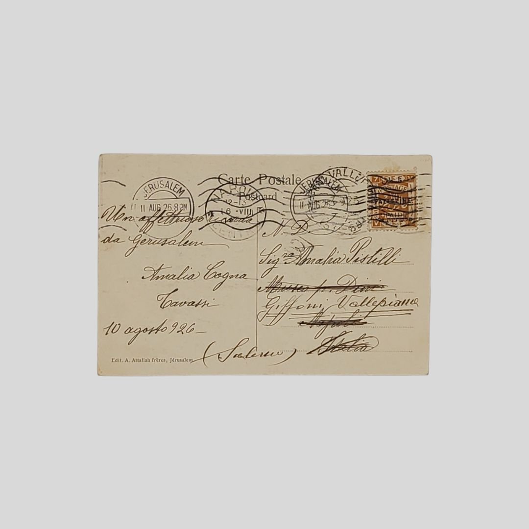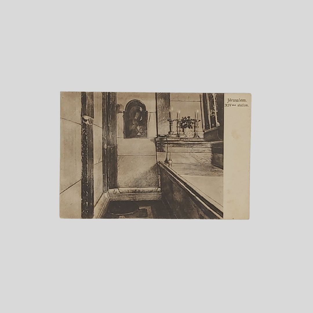 Cartolina fotografica d’epoca virata in seppia. Viaggiata, 10/8/1926, cm 13,5×9. Francobollo, timbri. Gerusalemme, interno del Santo Sepolcro. Tracce d’uso.
