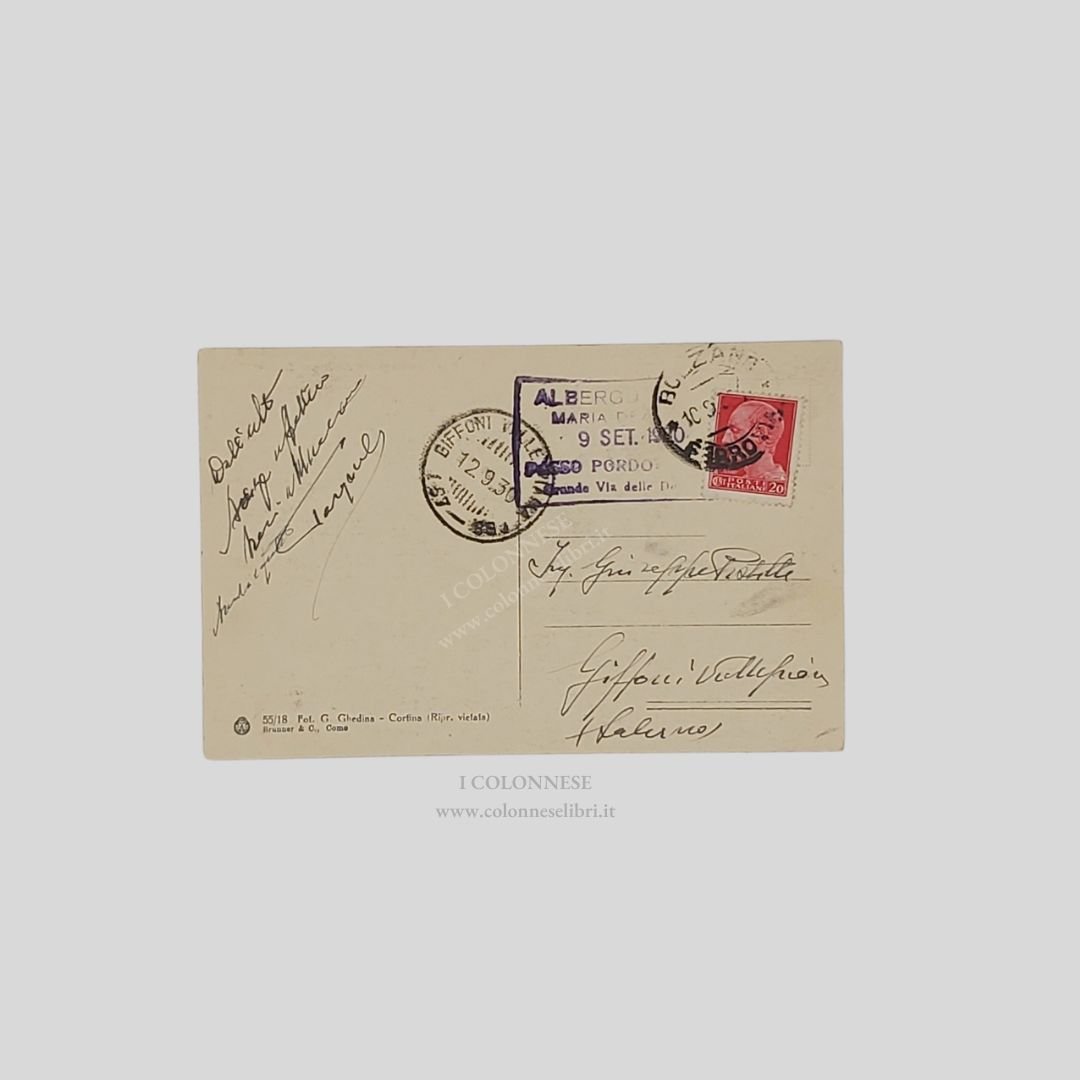 cm 14×9. Cartolina originale fotografica. Viaggiata. Cortina. Fot. G. Ghedina. Francobollo, timbri, (12/9/1930) e timbro dell’Albergo. Lievi tracce d’uso al verso.