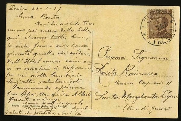 Cartolina in bianco e nero di misure 14x9 cm. Condizioni : USATO - Stato : Buono, ordinari segni d'uso e del tempo. Altre note : Viaggiata con francobollo e timbro di annullo di Levico.