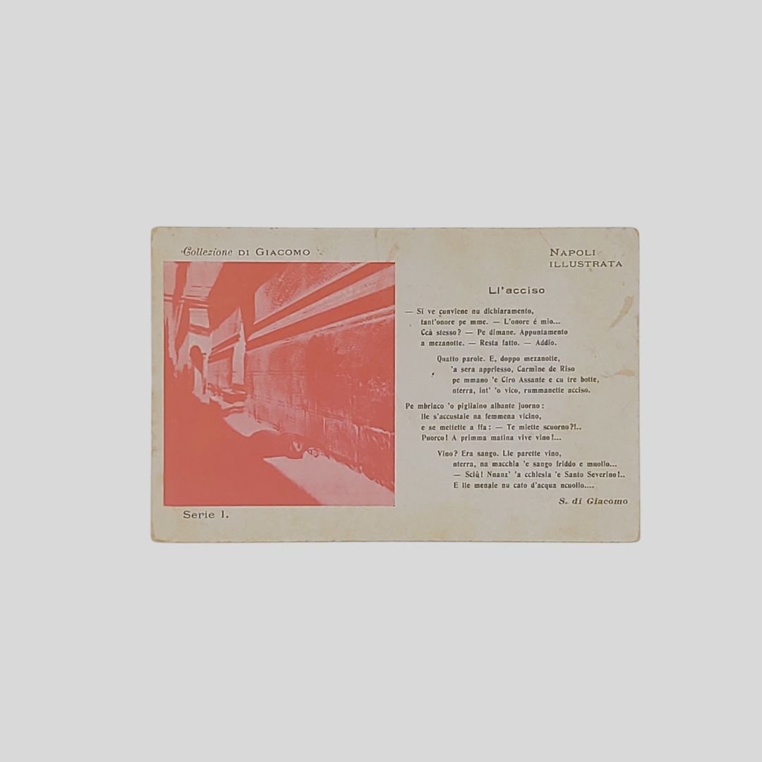 Cartolina originale non viaggiata. Napoli Illustrata. Serie I, s.d. (1900), cm 14×9. Undivided back. Tracce d’uso. Piegature. Strappi senza perdita di testo.