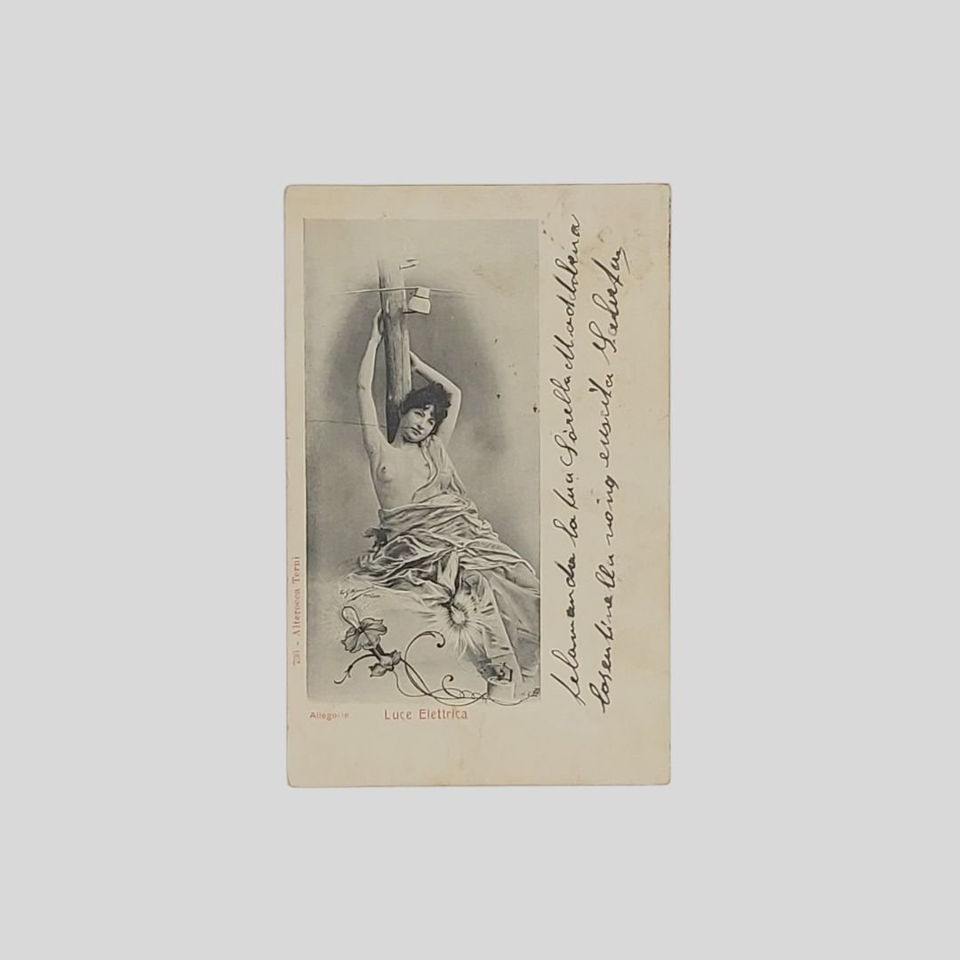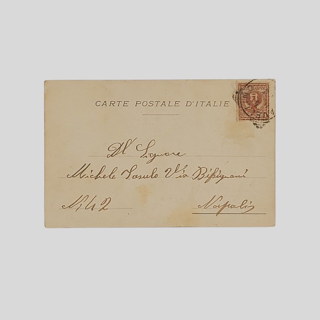 Cartolina fotografica d’epoca, Art nouveau. Undivided back. Viaggiata, cm 9×14. Timbro, francobollo. Lievi tracce d’uso. Foto G.B. Ganzini – Milano. Non comune. Serie n. 736.