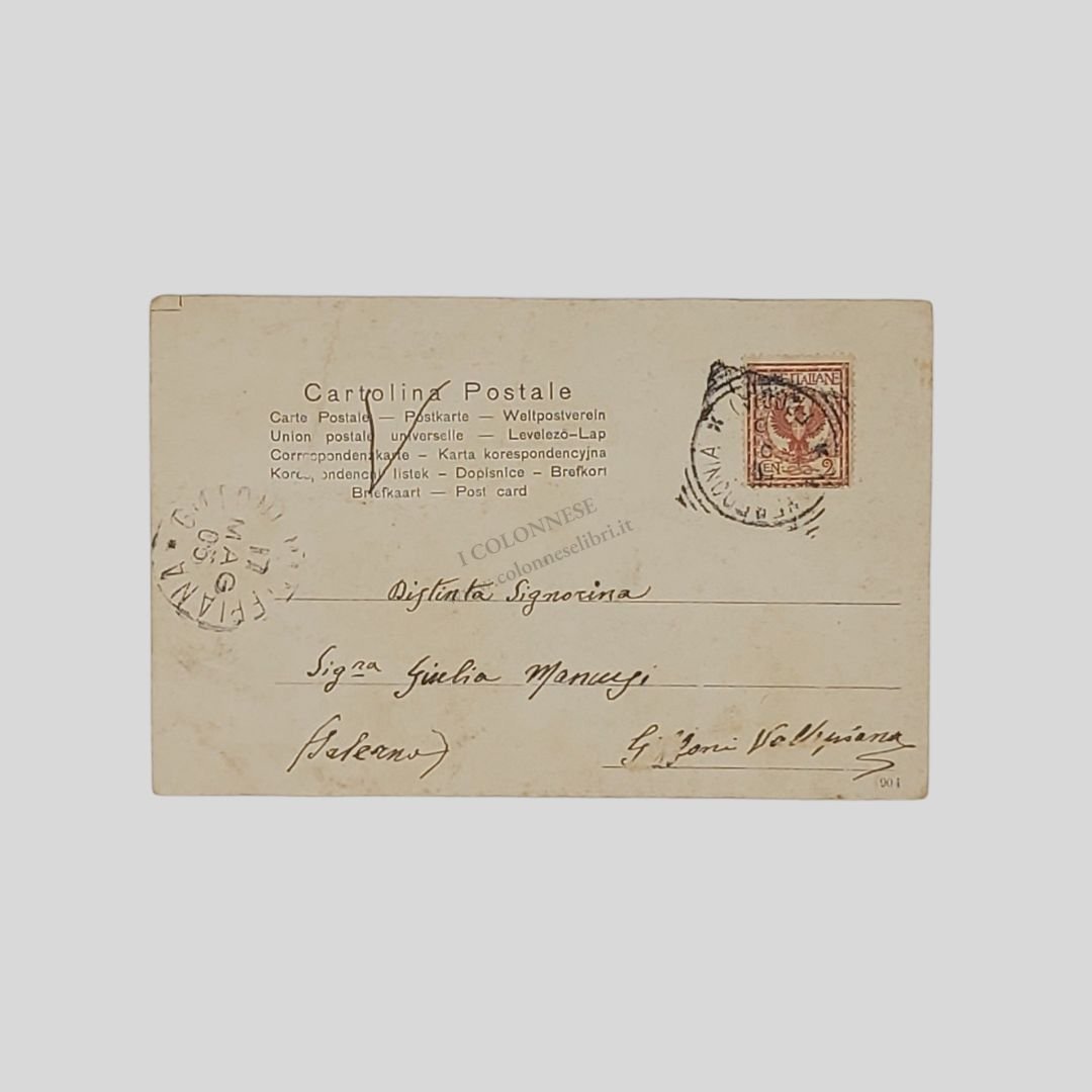 Undivided back. Cartolina d’epoca a colori. Viaggiata, cm 14×9. Francobollo, timbri (17/5/1905). Tracce d’uso agli angoli, lieve alone e incrinatura. Animata, con barche ormeggiate.