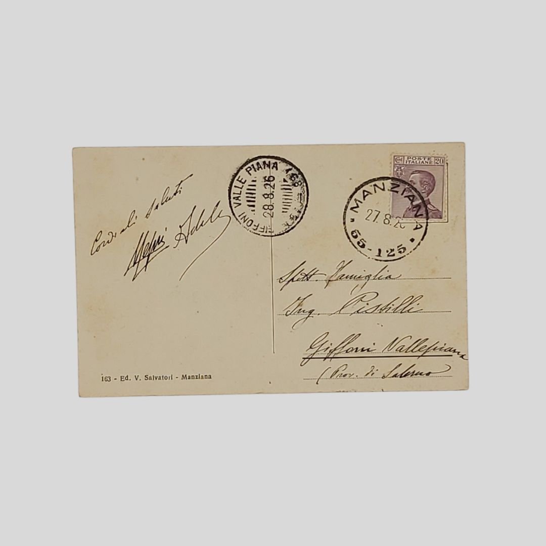 cm 14×9. Cartolina fotografica originale virata in seppia viaggiata, timbri, francobollo, postalizzata il 28/8/1926. In buone condizioni.