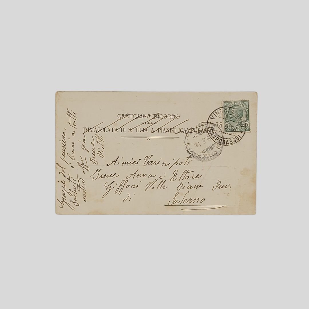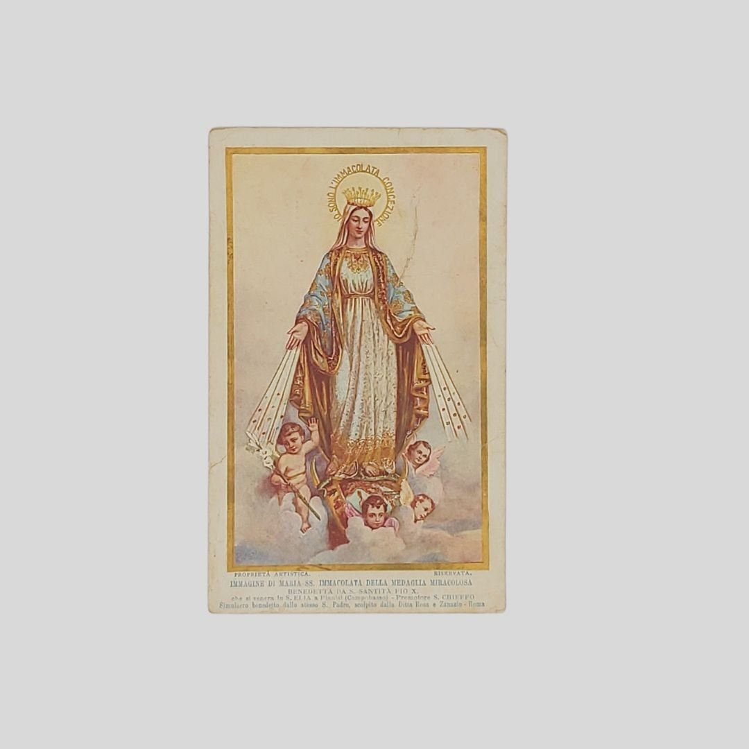 Undivided back. Cartolina d’epoca in cromolitografia. Viaggiata, cm 9×14. Francobollo, timbri, postalizzata il 18/6/1918. Evidenti tracce d’uso e incrinature. Immagine di Maria SS. Immacolata della medaglia miracolosa, Benedetta da S. Santità Pio X Che si venera a S. Elia a Pianisi (Campobasso).<BR>Rara.