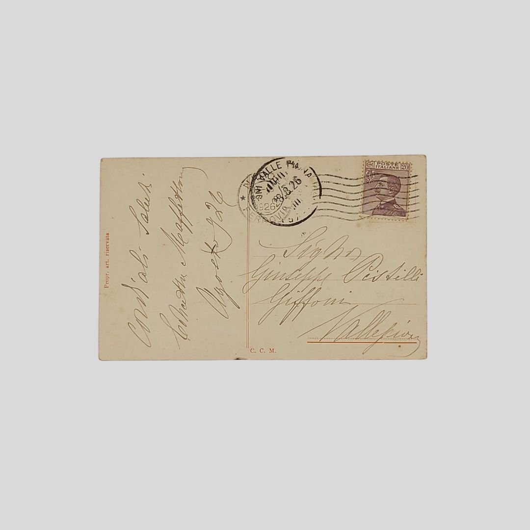 Cartolina pittorica d’epoca. Viaggiata, cm 13,5×8,5. Francobollo, timbri (28/8/1926). Lievi tracce d’uso agli angoli.