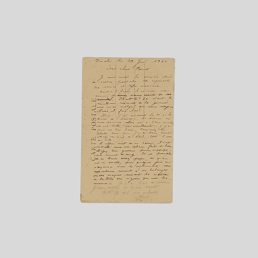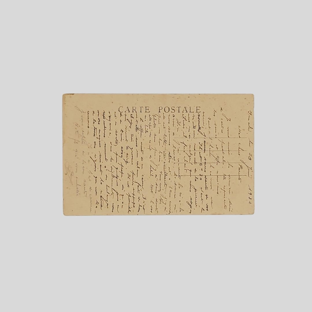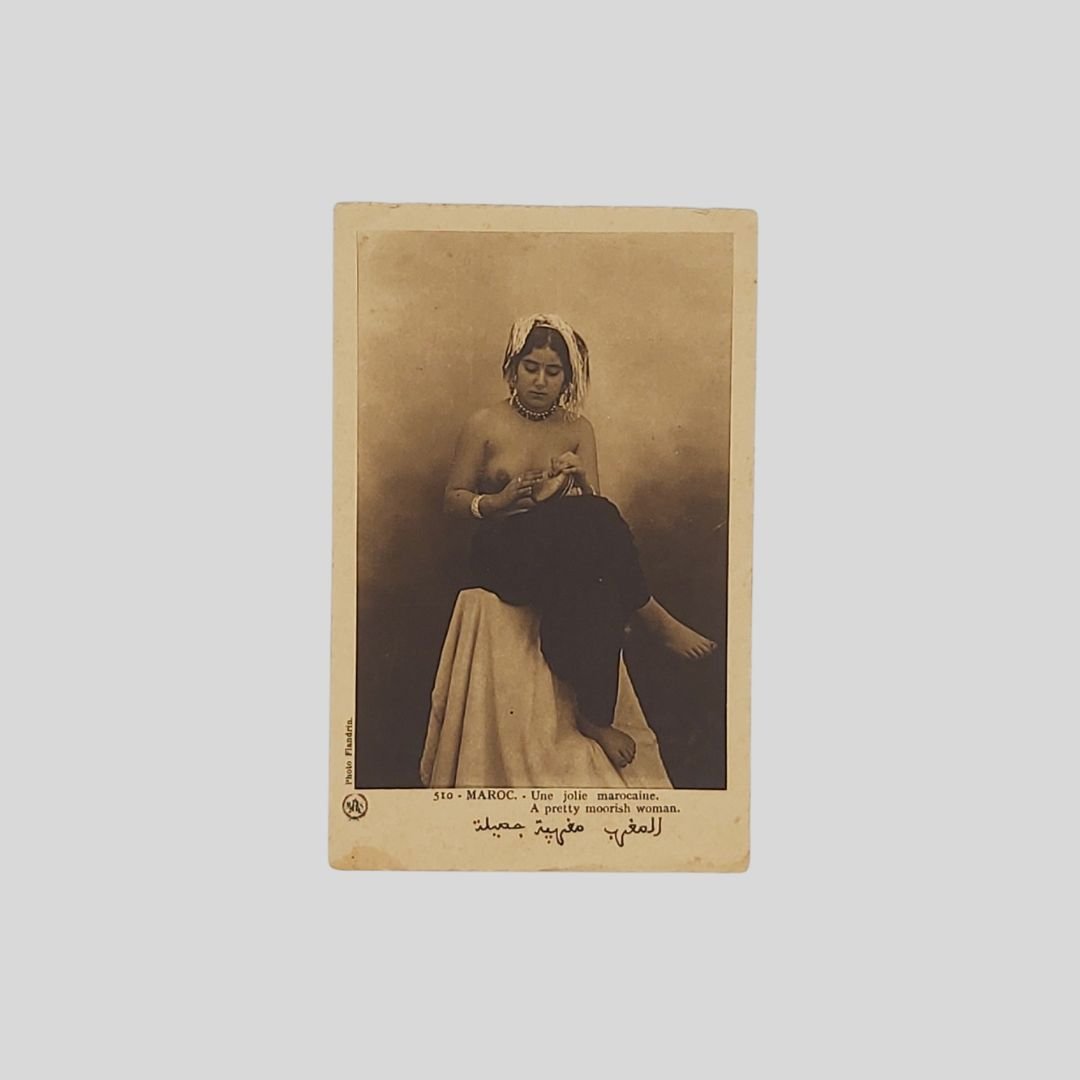 cm 9×14. Cartolina fotografica d’epoca virata in seppia. Non viaggiata, ma con invio di mano sincrona del 1932, testo in francese. Tracce d’uso, piccola piega all’angolo sinistro. L’immagine raffigura una giovane donna marocchina a seno nudo, seduta con un tamburello in mano, ornata da copricapo, tatuaggi tradizionali e gioielli. Il soggetto, spesso identificato come una prostituta, riflette la moda europea dell’epoca di collezionare ritratti esotici e sensuali sotto forma di “documentazione etnografica”.<BR><BR>