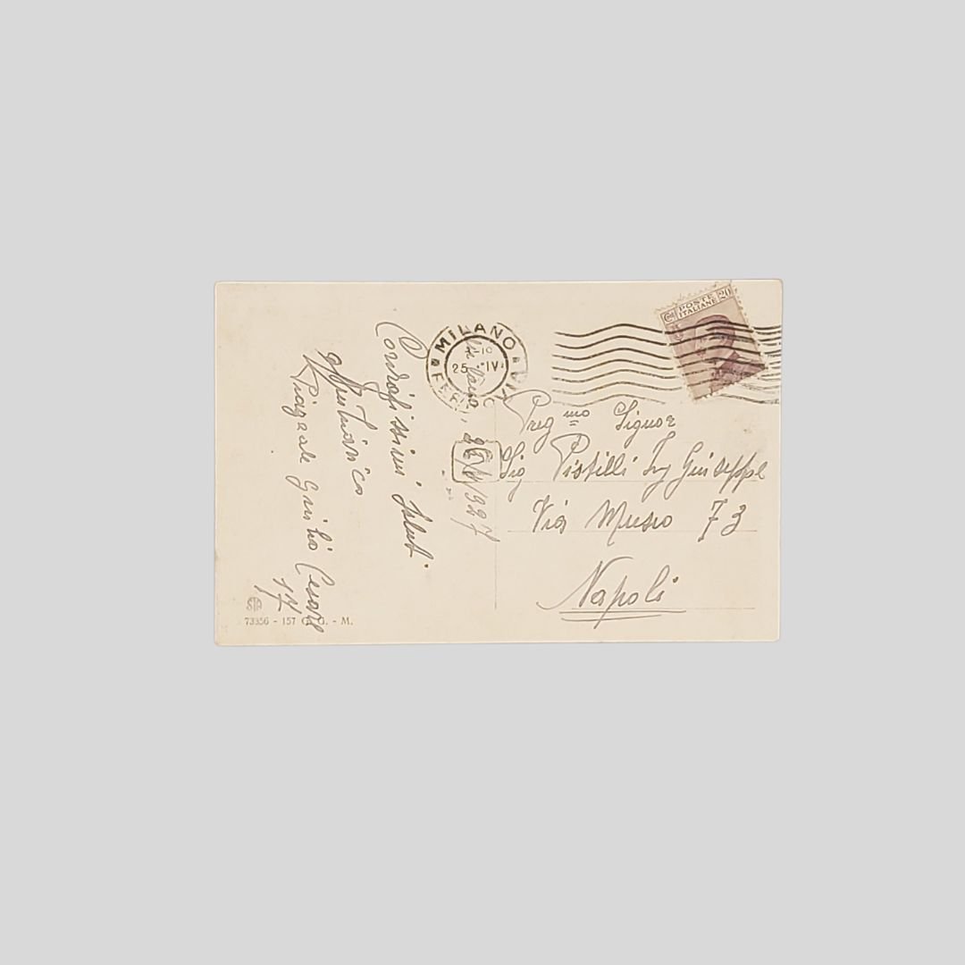 Cartolina d’epoca. Viaggiata, invio del 25/4/1927. G.G.-M., cm 13,5×8,5. Francobolloe timbro. Tracce d’uso. Molto animata.
