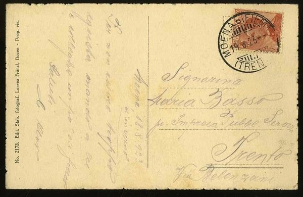 Cartolina in bianco e nero di misure 13,7x8,8 cm. Condizioni : USATO - Stato : Buono, ordinari segni d'uso e del tempo. Altre note : Viaggiata con francobollo e timbro di annullo di Moena.