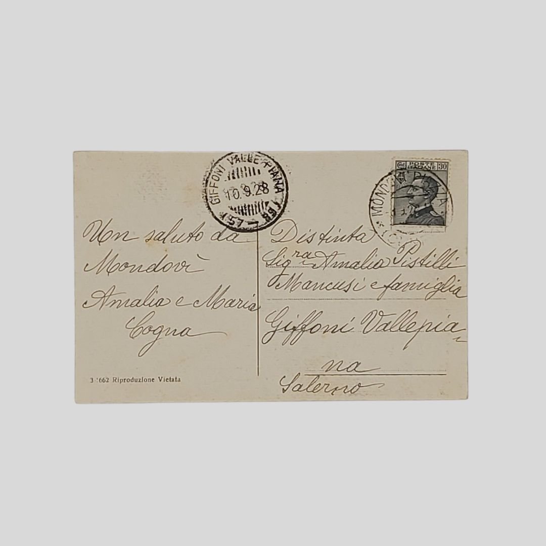 cm 8,5x13,5. Cartolina fotografica originale viaggiata, timbri, francobollo, postalizzata il 10/9/1928. Alone del timbro postale al recto.