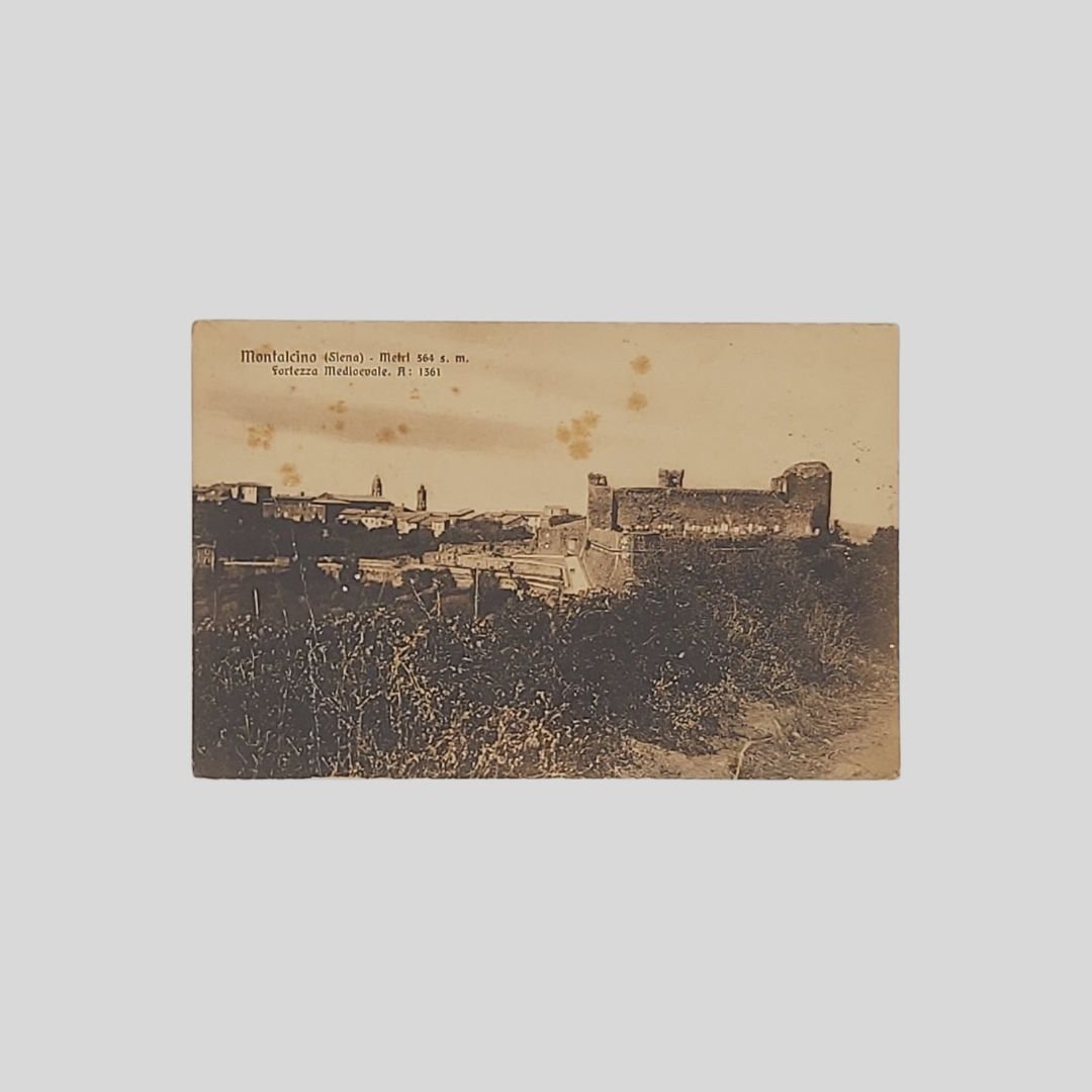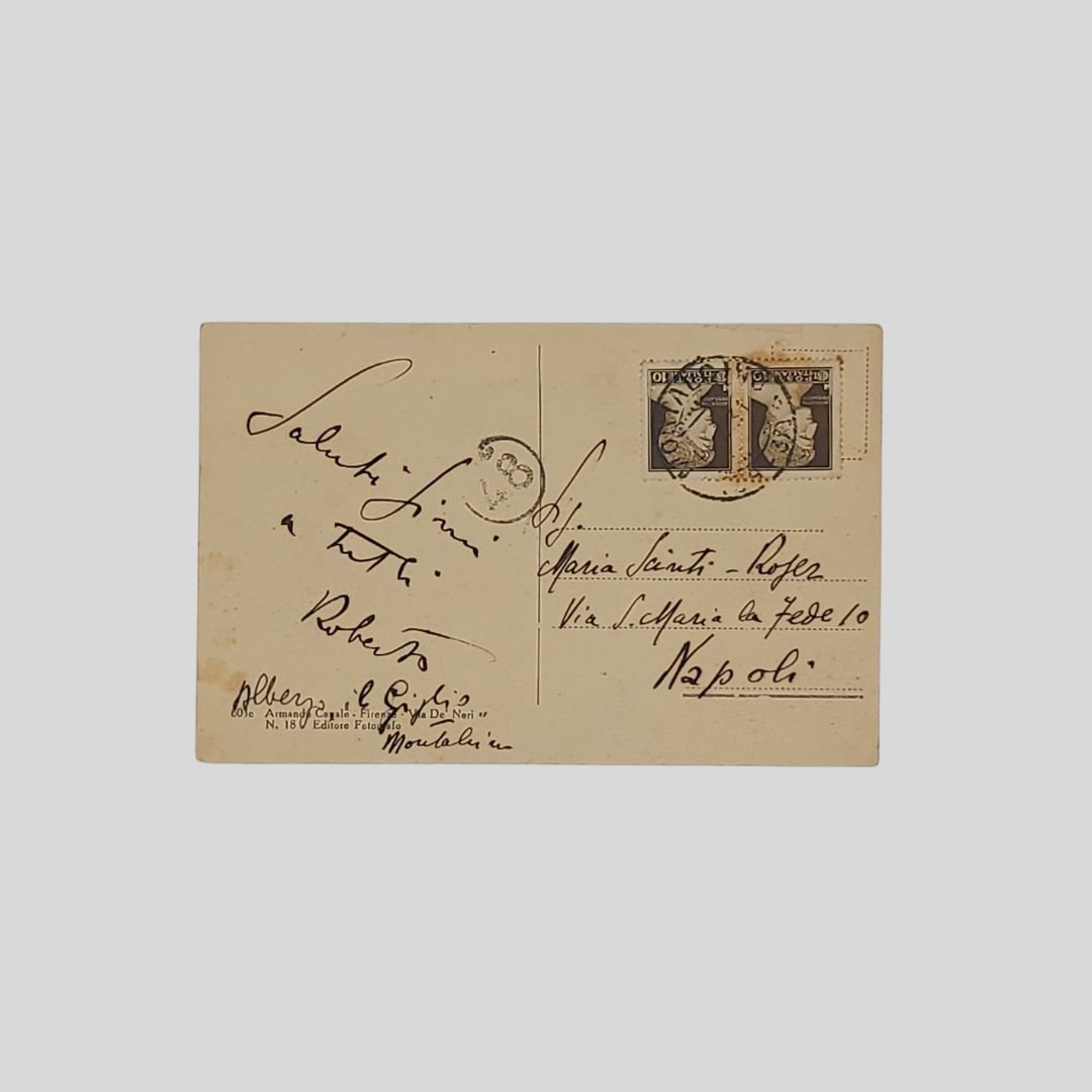 cm 14,9. Cartolina fotografica originale virata in seppia, (s.d., anni '30), viaggiata, timbro, francobolli. Con significative tracce d’uso.