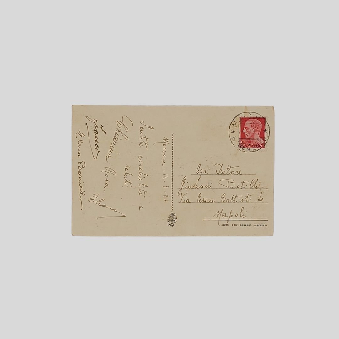 Cartolina d’epoca. Viaggiata, 14/9/1937. Ediz. Gerardo Parcesepe, cm 14×9. Francobollo, timbro postale e annullo pubblicitario “Lotteria di Merano”. Animata. Rara.