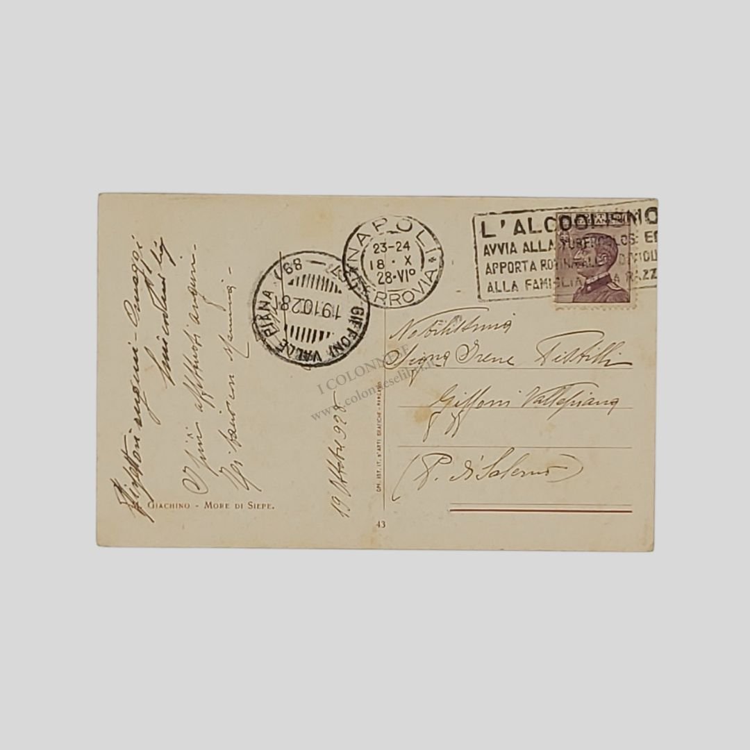 cm 14x9. Cartolina d’epoca a firma Marcello Giachino. Viaggiata, datata 19/10/1928. Francobollo, timbri. Tracce d’uso anche agli angoli.