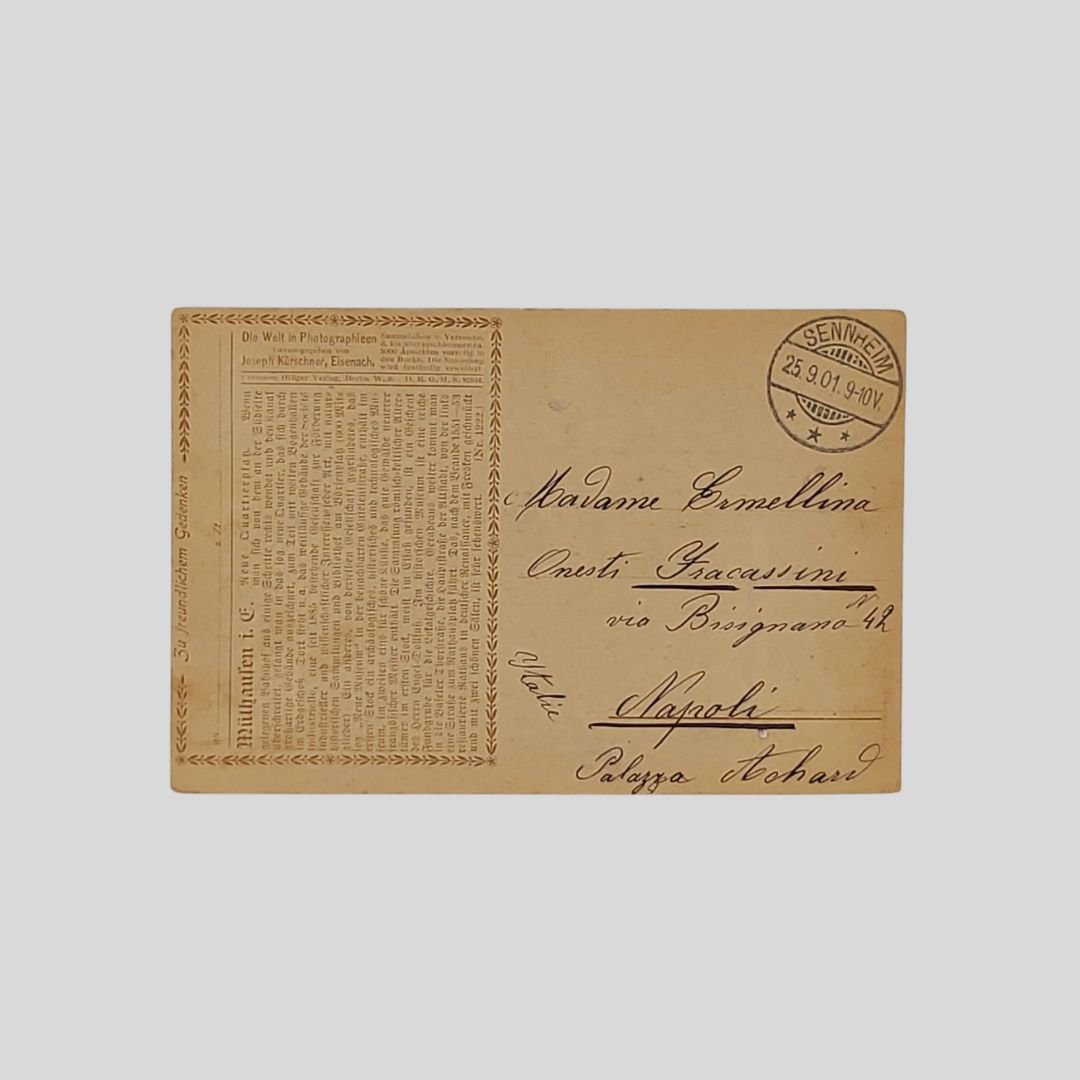 cm 14,3x9,4. Cartolina d’epoca. Viaggiata. Francobollo (Reichspost 10 Pf.) al recto, doppio timbro postale al recto-verso, lieve impronta del timbro al recto. Tracce d’uso, lievemente ondulata. Postalizzata il 25/9/1901. Molto animata, carrozze, cavalli, cappelli, copricapi. Sullo sfondo lo storico Cafè Moll. Vera fotografia, Berlin-Steglitz, Neue Photographische Gesellschaft,