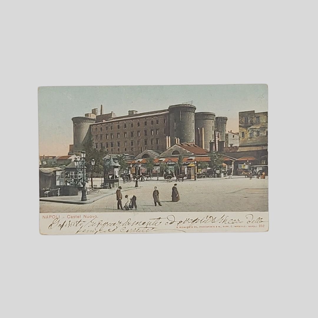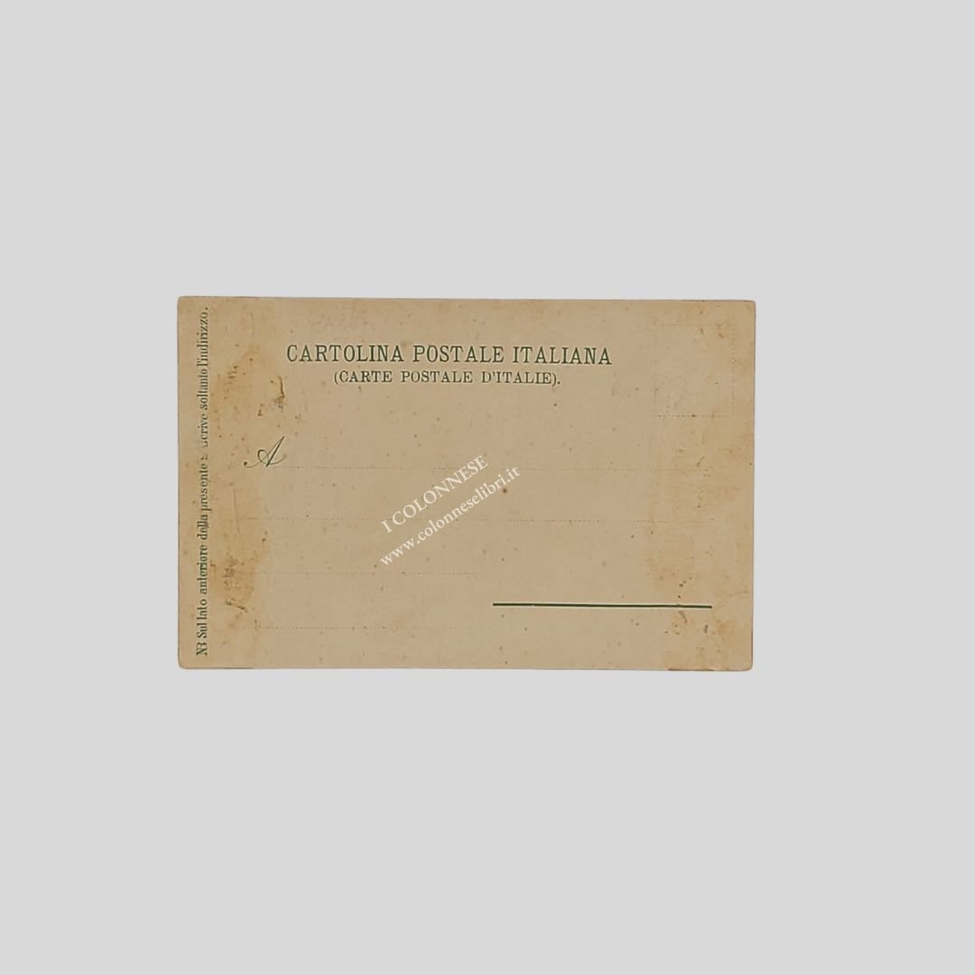 Undivided back. Cartolina d’epoca, cm 14x9. Non Viaggiata. Invio di mano sincrona a china. Tracce d’uso al verso. Animata, in secondo piano carrozze con cavallo