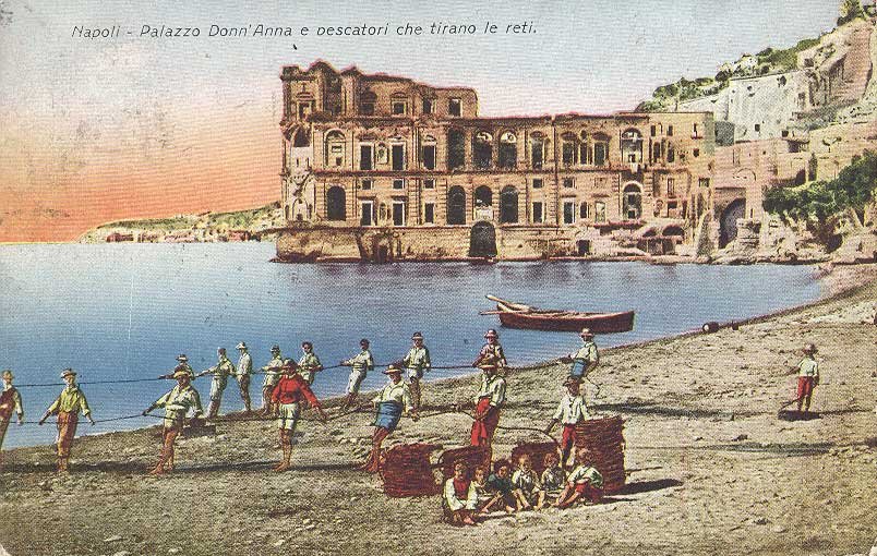 NAPOLI. PALAZZO DONN'ANNA E PESCATORI CHE TIRANO LE RETI.