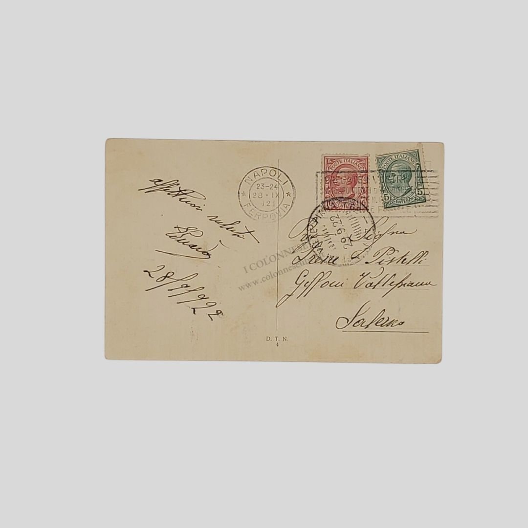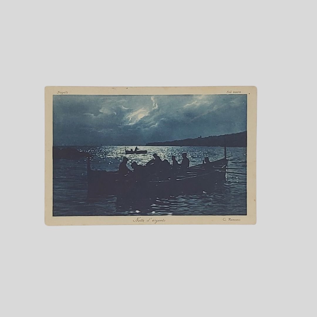 Cartolina fotografica d’epoca. Viaggiata, datata 28/9/1922, cm 14×9. Fotografia di G. Romano. Francobolli, timbri. In buone condizioni. Animata, barca e pescatori in primo piano. Rara.