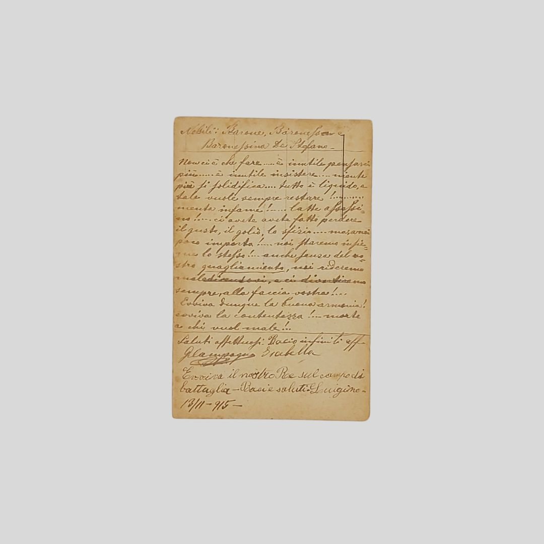 cm 9x14. Cartolina d’epoca. Non viaggiata, ma con invio di mano sincrona al recto-verso del 13/11/1915. Tracce d'uso.