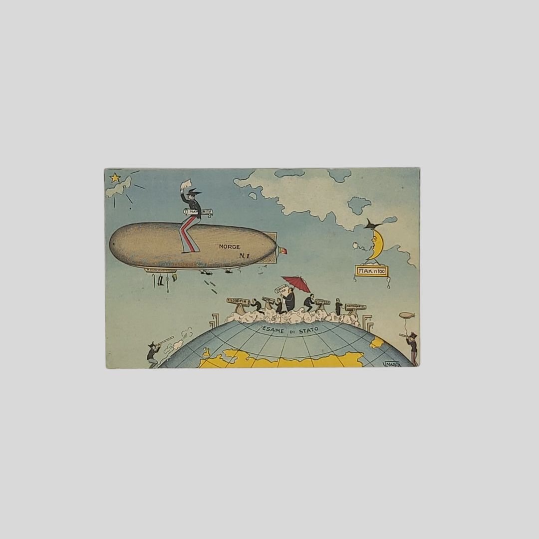 cm 14×9. Cartolina d’epoca a firma V. Marra. Viaggiata, invio del 13/8/1927. Molto rara. Cartolina nell’usuale stile goliardico, in primo piano giovane militare della Nunziatella a cavalcioni del dirigibile Norge.