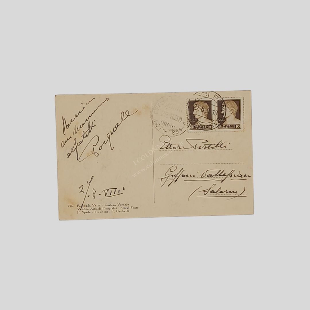 Cartolina fotografica originale. Viaggiata, cm 13,5×8,8, 27/8/1930. Fiuggi Fonte, Fotografia Velox, Gustavo Verdejo, timbri e francobolli. Alone del timbro al recto.