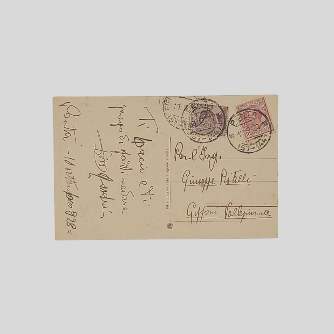 Cartolina d’epoca virata in seppia. Viaggiata, invio del 10 settembre 1928. Edizione Eugenio Nastri, cm 9×14. Francobolli, timbri. In buone condizioni. Non comune