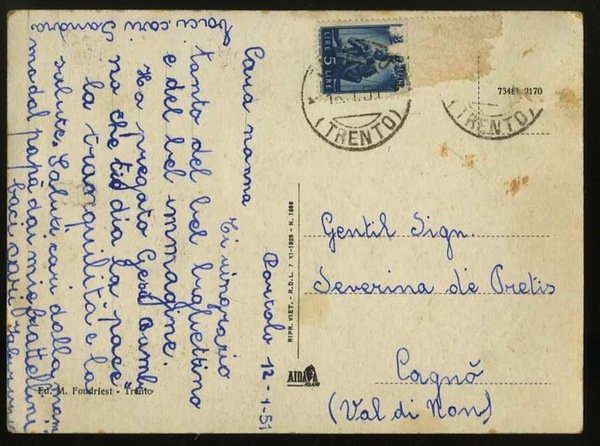 Cartolina in bianco e nero di misure 14,8x10,7 cm. Condizioni : USATO - Stato : Buono, ordinari segni d'uso e del tempo. Altre note : Viaggiata con timbro e francobollo.