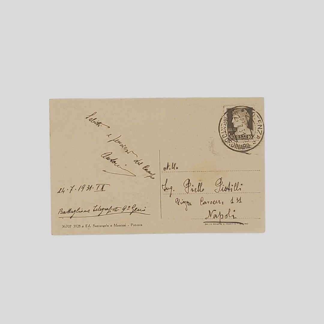 cm 13,5×8,5. Cartolina d’epoca. Viaggiata, invio del 24/7/1931. Francobollo, timbri. Tracce d’uso al margine inferiore.