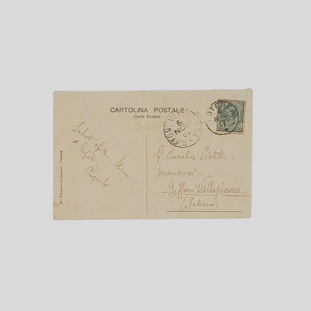 cm 14x9. Cartolina d’epoca. Viaggiata. Francobollo, timbri, postalizzata il 4/11/1909. Tracce d’uso.