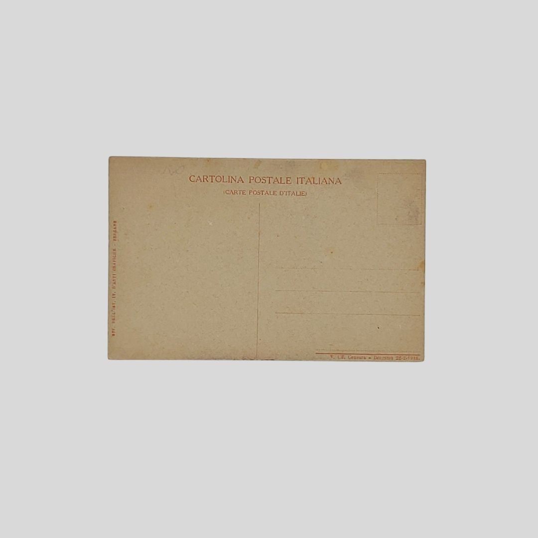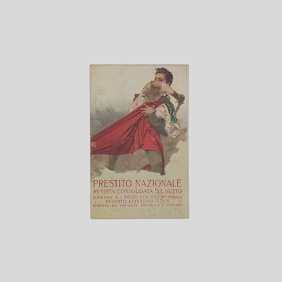 cm 8,5×13,5. Cartolina d’epoca. Lievi tracce d'uso agli angoli e al verso. «Emessa a L. 86,50 per 100 nominali. Reddito effettivo 5,78% Esente da Imposte presenti e future». Raffigura un soldato italiano (l’Italia) che con una mano stringe a sé la bandiera italiana e con l’altra mano brandisce una spada.