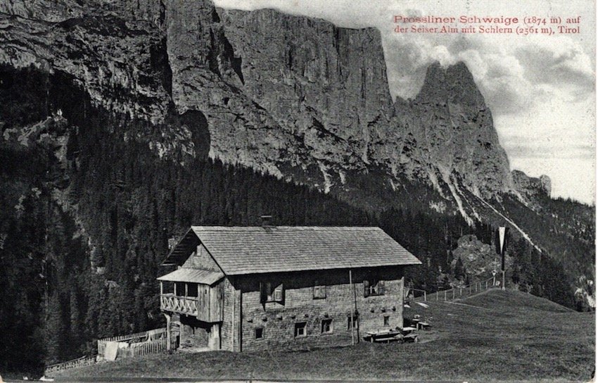 Prossliner Schwaige (1874 m) auf der Seiser Alm mit Schlern (2561 m), Tirol.