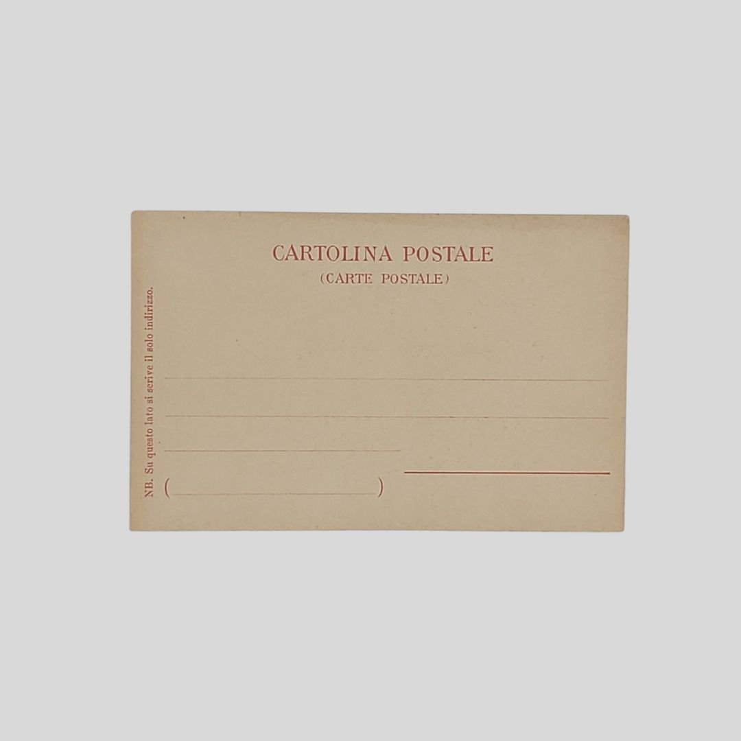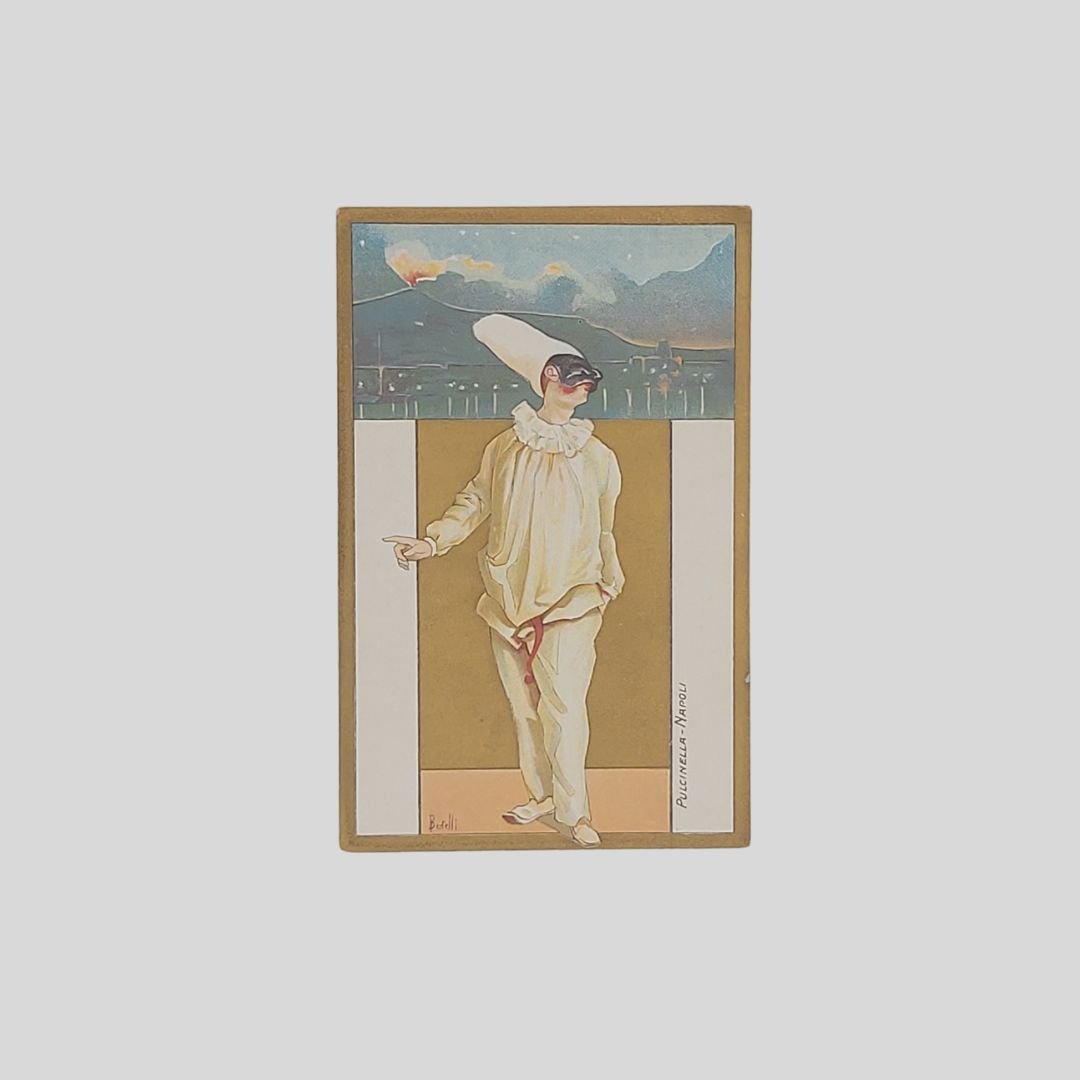 mm 90×140. Bella cartolina in cromolitografia originale di P. Bertelli. Undivided back, non viaggiata. Sullo sfondo Golfo e Vesuvio in eruzione. In perfette condizioni. Rarissima Pulcinella antichissima maschera napoletana, la «meza sola» più famosa della commedia dell’arte, in una rarissima e raffinata versione Art Nouveau di P. Bertelli La rara cartolina attribuita all’artista P. Bertelli (Cfr. Furio Arrasich) fa parte di “Maschere. Serie di 12 cartoline”, dedicate ad altrettante maschere della Commedia dell’Arte, «pubblicate in album dall’editore Giovanni Mengoli di Bologna probabilmente in occasione della Esposizione Nazionale di Orticoltura e Floricultura inaugurata a Bologna il 12 maggio 1900». [Cfr. Fondazione Carisbo (che le attribuisce all’artista Flavio Bertelli, n.d.c.)]