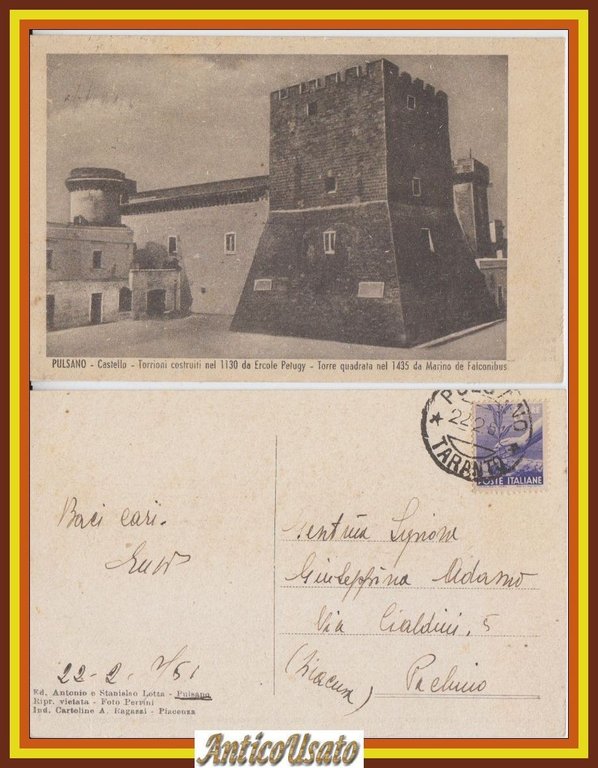 PULSANO CASTELLO Torrioni costruiti nel 1130 da Ercole Pelugy, Torre Quadrata nel 1435 da Marino De Falconibus. Cartolina Viaggiata 1951
