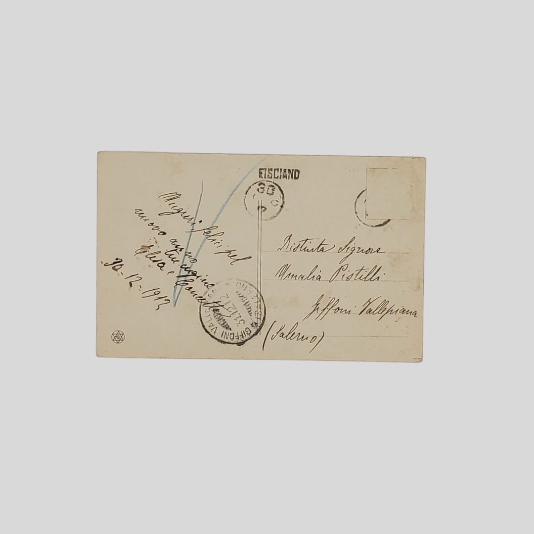 Cartolina floreale d’epoca. Viaggiata, invio del 30/12/1912, cm 9×14. Timbri, francobollo asportato. Tracce d’uso.