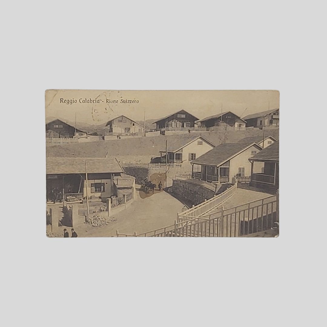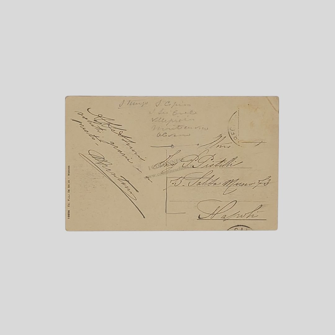 cm 13,5×8,5. Cartolina fotografica d’epoca. Viaggiata. Francobollo asportato, timbro postale al recto-verso. Piega all’angolo superiore sinistro e tracce d’uso agli altri angoli, piccolo alone centrale. Animata, in secondo piano carrozza con cavallo. Molto rara.