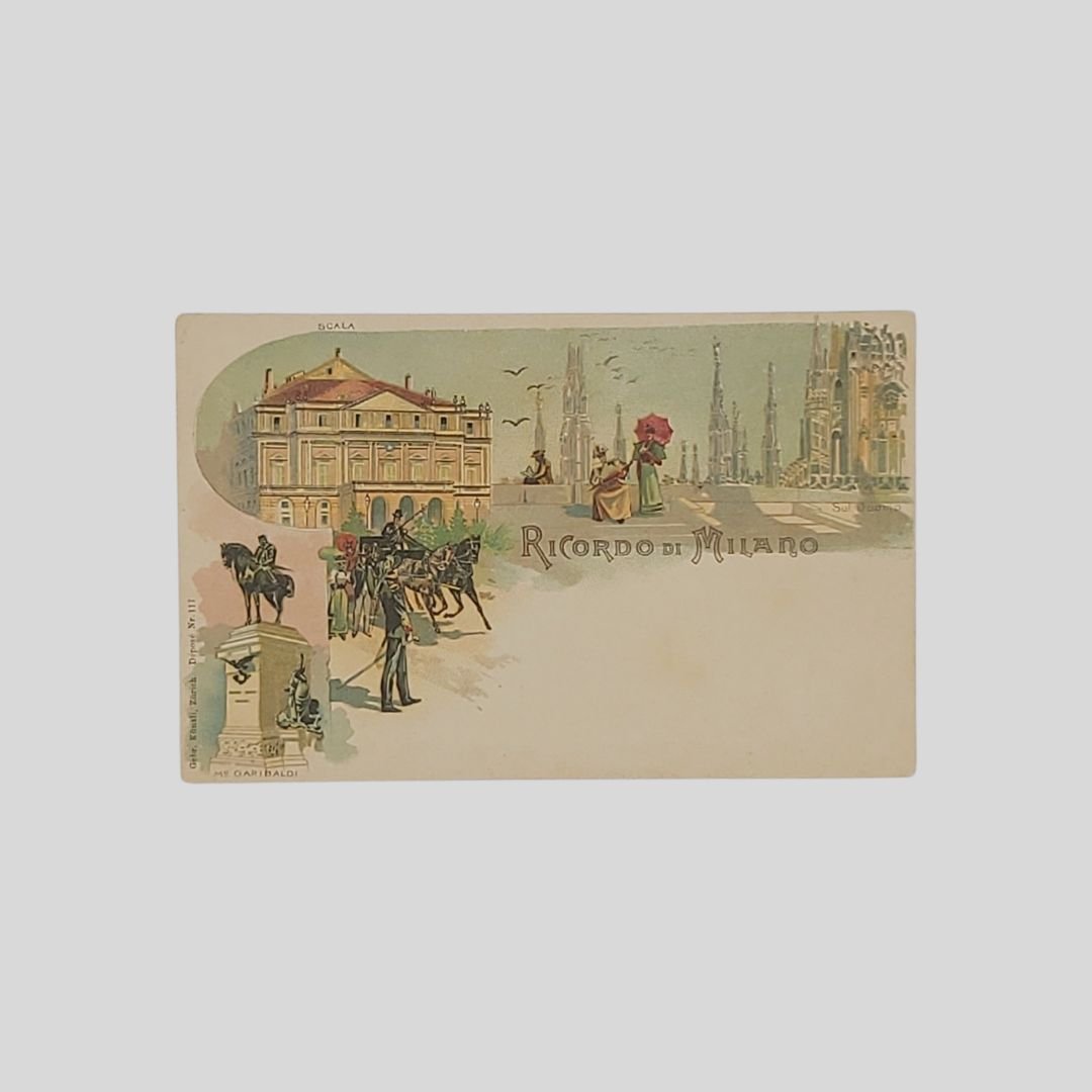 Ricordo di Milano. Cartolina Gruss aus: Duomo, Teatro alla Scala, Monumento a Garibaldi.