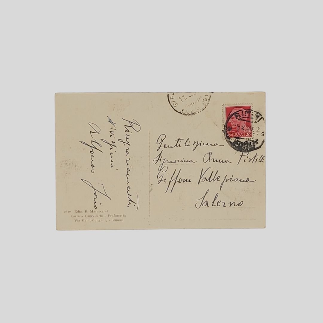 cm 14×9. Cartolina d’epoca. Viaggiata. Francobollo, timbri, postalizzata il 9/8/1930. Tracce d’uso e aloni. Animata con barche a vela in primo piano. Rara
