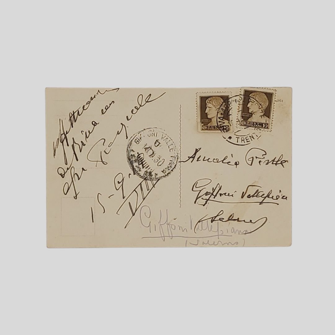 Cartolina fotografica originale viaggiata, s.d., (fine anni ’20), cm 14x9, timbri, francobolli, postalizzatta il 18/9/1930. In buone condizioni.