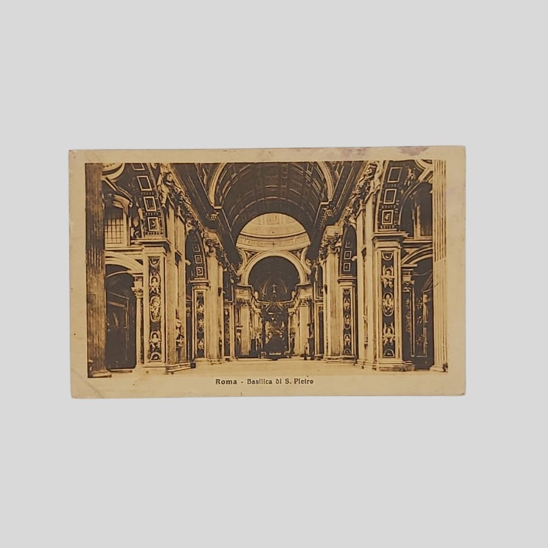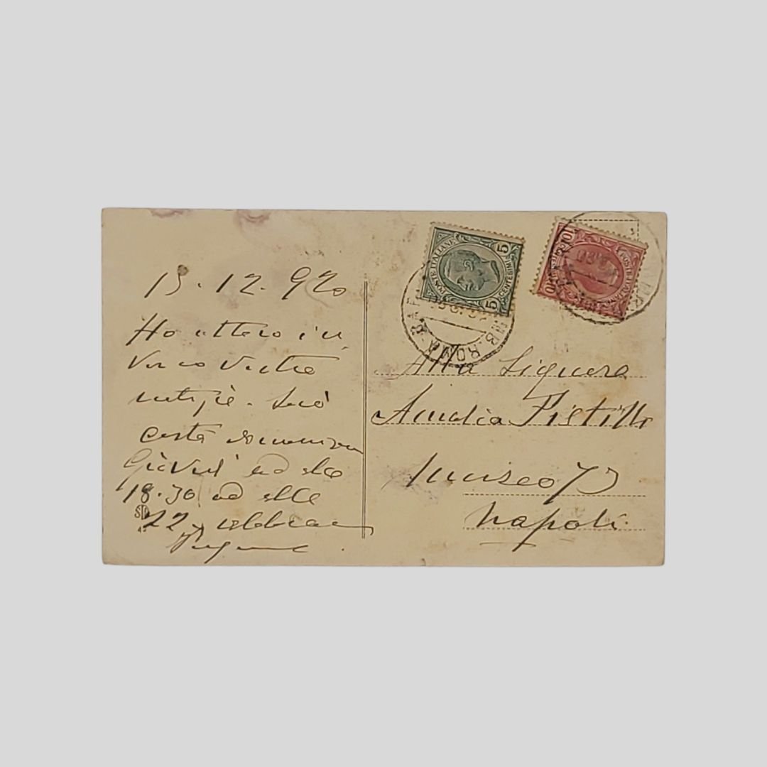 Cartolina fotografica originale virata in seppia, viaggiata, cm 14×8,7, timbri, francobolli. Datata 19/12/1920. Tracce d’uso.
