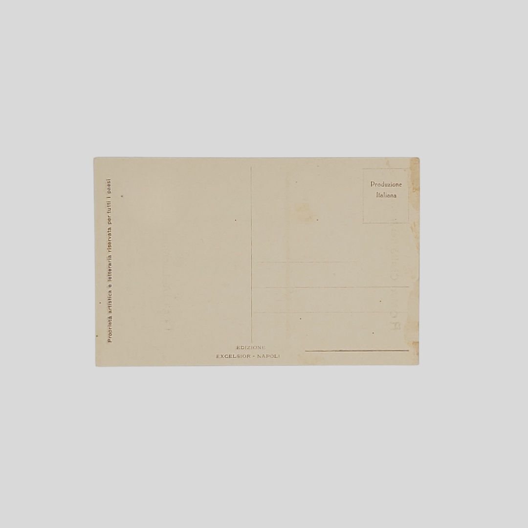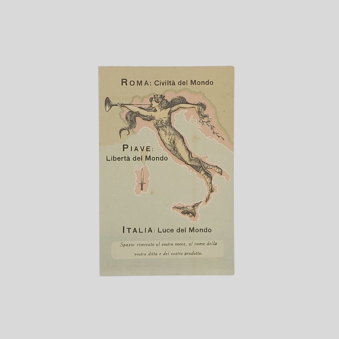 Cartolina d’epoca patriottica, con fini pubblicitari. Non viaggiata. Napoli, Edizione Excelsior, s.d., (1916 ca.), cm 9×14. Insignificanti segni del tempo. In buone condizioni. Molto rara. Italia turrita che si distende lungo la penisola. Al margine inferiore «Spazio riservato al vostro nome, al nome della vostra ditta e del vostro prodotto». Molto rara.