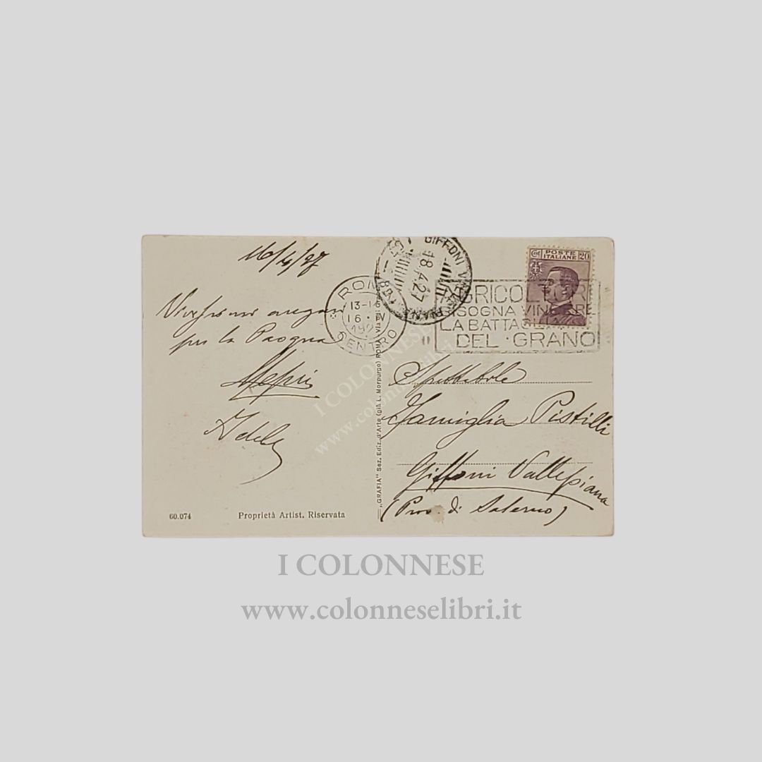 cm 14×9. Cartolina fotografica originale viaggiata, timbri, francobolli. Datata 16/4/1927. Tracce d’uso.