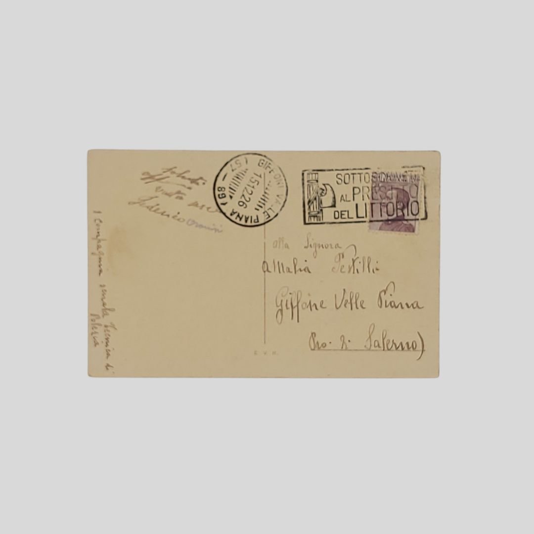 Cartolina fotografica originale virata in seppia viaggiata, s.d.,(anni ’20), cm 14×9, timbri, francobollo, postalizzata il 15/12/1926.