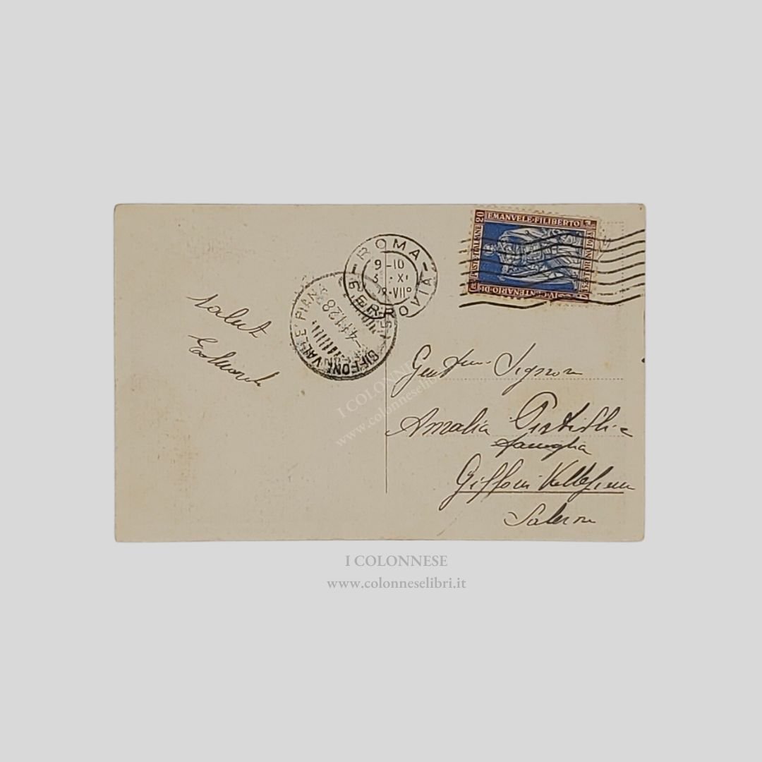 Cartolina fotografica originale. Viaggiata, cm 14×9, francobollo, timbri, postalizzata 4/11/1928. Animata, in primo piano carrozza e carretto da traino. Alone dei timbri al recto.
